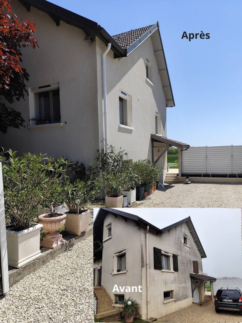 Prestations: (façade) traitement fongicide + lavage haute pression + régulateur de fond minérale + 2 couches de peinture minérale + traitement de la toiture + 2 couches de peinture pour sol sur les tablettes de fenêtre.